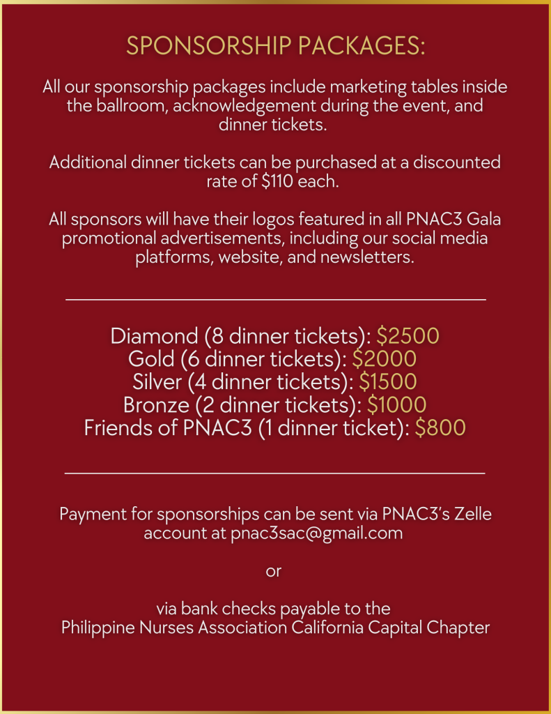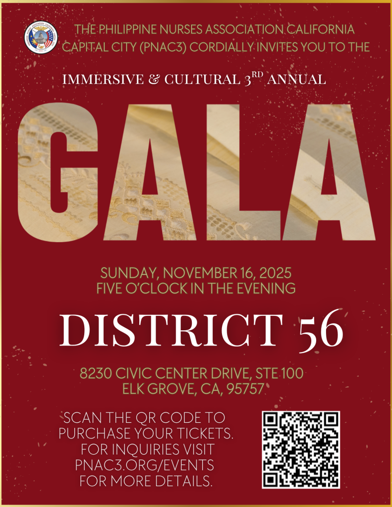 The Philippine Nurses Association California Capitol Chapter (PNAC3) is pleased to announce that we will be hosting our Third Annual Fundraising Gala on November 16, 2025 at District 56 in Elk Grove, CA. The event starts at 5:00pm until 10:00pm.