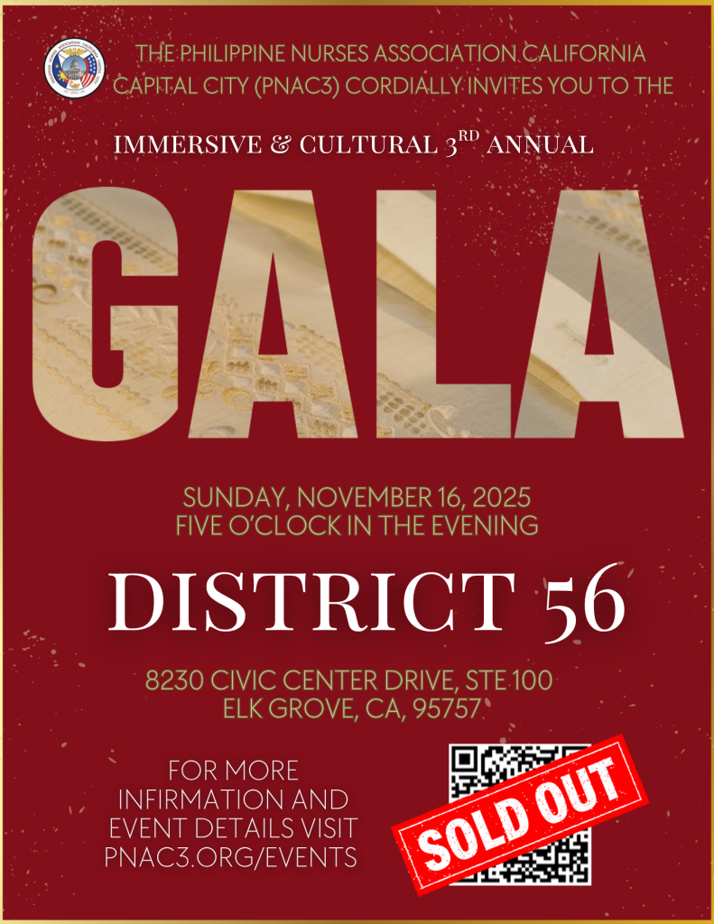 The Philippine Nurses Association California Capitol Chapter (PNAC3) is pleased to announce that we will be hosting our Third Annual Fundraising Gala on November 16, 2025 at District 56 in Elk Grove, CA. The event starts at 5:00pm until 10:00pm.